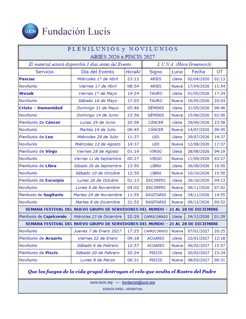 NOTA 2 – PUBLICACIONES: Los Servicios de Meditación se publican por redes (Facebook – YouTube – Telegram) y se informan por correo electrónico a quienes estén suscriptos a través de contacto en este sitio, u otros medios que sirvan al efecto de lograr una invocación masiva, simultánea y unida en orden a remplazar el actual materialismo existente en las relaciones humanas e internacionales y en los asuntos mundiales, por los valores espirituales.